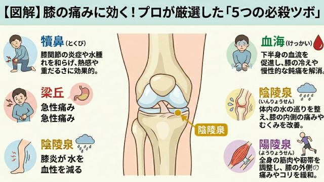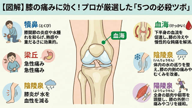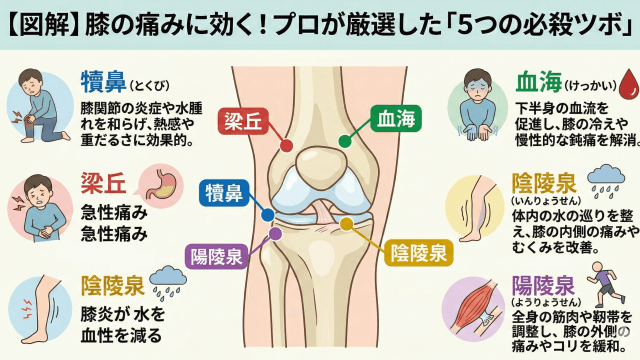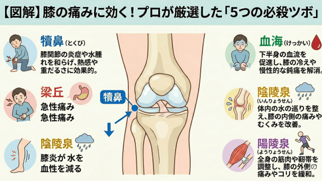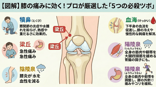 【図解】膝の痛みに効くツボはここ!プロが教える「5つの必殺ツボ」と正しい押し方