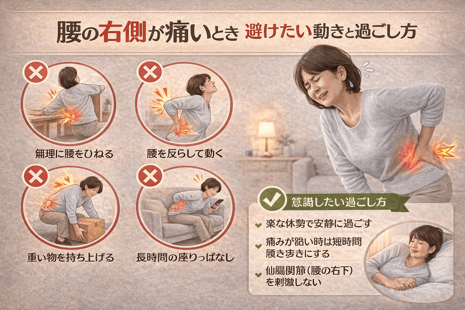 腰の右側が痛いときは、前かがみ・ひねり・反り腰・勢いのある動きで痛みが跳ねやすく、右側に負担が寄る生活習慣が続くと長引きやすくなります。